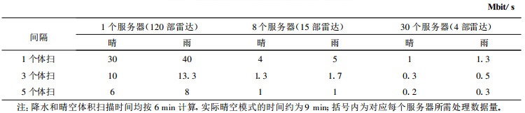 表 1给出了CINRAD全网 (以120部雷达计) 由雷达站网向气象业务主干网传输雷达基数据的试验结果。数据压缩方法采用通用压缩软件BZIP2, 统计表明雷达基数据的平均压缩率约为1/10(晴空时压缩率约为16:1, 降水时约为6:1)。表 1将准 (非) 实时数据传输间隔分为1, 3和5个体积扫描间隔, 基数据区域服务器分为1个 (国家中心)、8个 (区域中心) 和30个 (省) 3种配置。由表 1可知, 在不考虑传输其他数据情况下, 当设置8个基数据服务器时, 10 M速率即可满足通讯需求。实际上, 区域基数据服务器的数量和通信带宽, 可根据实际需要并同时考虑远程业务网RPG用户对数据的需求状况进行配置。为避免远程用户对基数据的重复调用而增加通信负荷, 在远程业务网的服务器上建立数据“缓冲区”, 由LDM负责“缓冲区”管理和数据协调调度。
