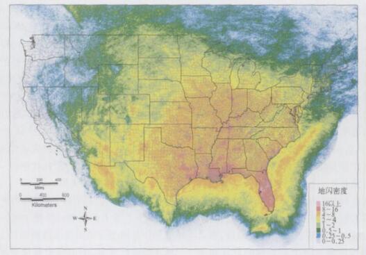 图 4. 美国2002-2004年间全国地闪密度分布 (单位:次·km-2·a-1) |