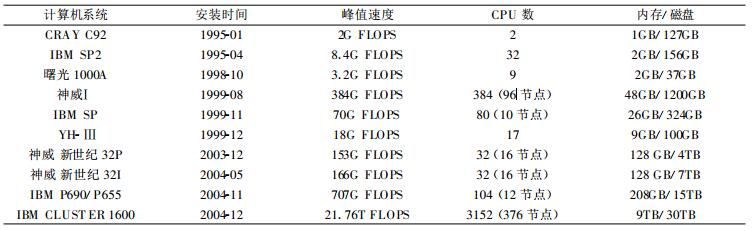 国家气象信息中心还是国内唯一同时以持续不间断业务方式运行向量巨型机、大规模并行机和高性能机群的国家级计算中心, 国内外主要高性能计算机厂商的产品均在中心落户安装, 并建立了一支有较丰富经验的高性能计算机系统维护、应用开发和场地运行的人才队伍。目前国家气象信息中心正在运行的计算机及运算能力如表 1所示。