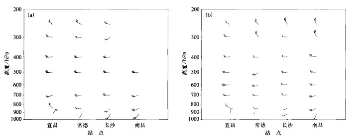 本文使用的资料为973项目“长江流域梅雨锋暴雨外场科学试验”的雷达观测资料, 共有宜昌、常德、长沙、南昌4个雷达站。所选的个例为2002年6月27日12:00(世界时, 下同) 至28日12:00发生在长江流域的一次暴雨过程。图 1a、图 1b分别为2002年6月27日12:00宜昌、常德、长沙、南昌的探空实况图和反演的VAD风廓线图。由图可以看出, 在高层为一致的西北风, 中层为西风。低层的风向切变和切变线位置也很好地反映出来。切变线位于常德站附近, 长沙、南昌处于切变线前为西南风, 宜昌处于切变线后为偏北风。另外VAD风廓线除了具有较高的时间分辨率外, 在空间分辨率上可以是任意高度层 (如600 hPa), 不像探空资料只有常规的等压面层。从图 1b还可以看出, VAD风廓线很好地弥补了南昌站高层缺测的情况。通过探空实况图和反演的VAD风廓线图对比可以看出, VAD风廓线资料具有很好的可靠性和较高的时空分辨率。