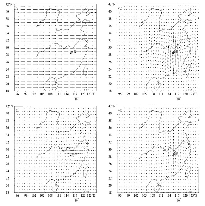 | 图 2. 理想试验风场背景场及同化后各层风矢量增量场 (单位: m/s) (a) 背景场, (b) 250 hPa同化分析增量场, (c) 500 hPa同化分析增场, (d) 850 hPa同化分析增量场 Fig 2. Wind background field and the increment wind vector field at all levels by assimilation in ideal test (unit: m/s) (a) background field, (b) increment field by assimilation on 250 hPa, (c) increment field by assimilation on 500 hPa, (d) increment field by assimilation on 850 hPa | |