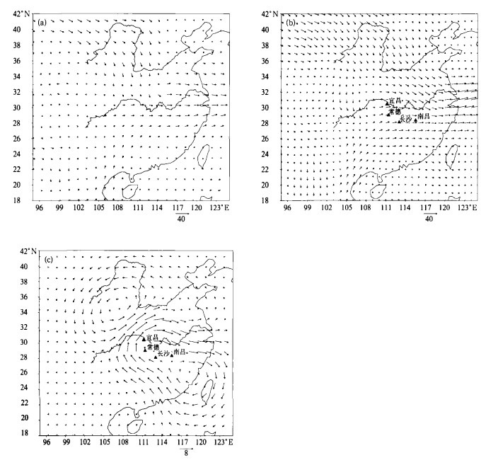 | 图 3. 2002年6月27日12:00 500 hPa风矢量场 (单位: m/s) (a) 背景场, (b) 实况场, (c) 同化分析增量场 Fig 3. 500 hPa wind vector field at 12:00 on June 27, 2002 (unit: m/s) (a) background field, (b) observation field, (c) increment field by assimilation | |
