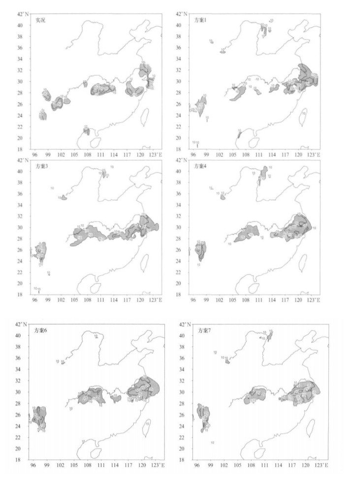 图 4a给出了2002年6月27日18:00—28日00:00的6 h降水量实况图。从图上可以看出, 在湖南北部至江西北部有一个强降水区域, 本次同化的雷达站中常德和南昌6 h降水分别为80.0 mm和27.0 mm。对比各数值试验方案的结果可以发现, 在未加入雷达风廓线资料时这一强降水区域的降水几乎没有预报出来。加入雷达风廓线资料同化后, 湖南北部的强暴雨区预报得到明显改善。同化了VAD风廓线资料后各方案都报出了10 mm以上的降水中心, 其中以方案6和方案7的改善最为显著, 基本上预报出了10~25 mm的暴雨区域。不足的是, 暴雨区域的位置稍偏西一些, 雨量较实况略偏小。总体来看, 同化VAD风廓线后对6 h强降水预报的改善较为明显。
