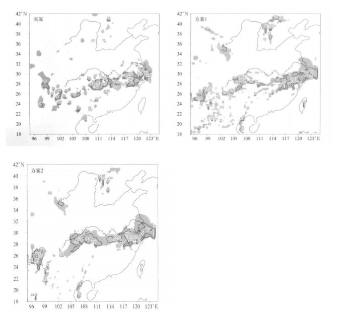 图 5分别给出了24 h降水实况 (图 5a)、不同化雷达资料的24 h降水预报 (图 5b) 和同化初始时刻雷达资料的24 h降水预报 (图 5c)。从24 h降水实况图上可以看出, 此次降水主要发生在长江以南, 从贵州中部到浙江沿海为一条准东西向的大雨带。由于实况观测是一个离散场, 所以在图形上表现得不是很连续。从24 h降水预报看, 同化后预报的方案 (图 5c) 要好于直接用T213预报场作为初始场的方案 (图 5b)。直接用T213预报场作为初始场的方案预报的雨带很短, 预报出了江西、浙江的大、暴雨, 但湖南以西的大、暴雨几乎没有预报出来。同化后的预报方案 (图 5c) 预报出了整条雨带, 雨带的位置和实况比较接近, 基本预报出湖南以西的大、暴雨中心。不足的是雨带较实况偏强, 在四川东南部和重庆一带有空报。另外, 无论同化与否, 24 h降水预报在华东地区均偏强, 有一定的空报情况。总体而言, 同化初始时刻雷达资料24 h降水预报对雨带的位置和强度均有改善。