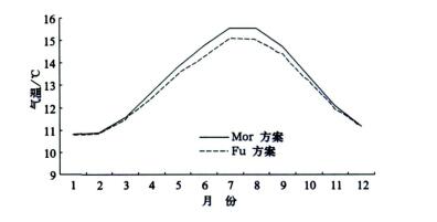 从能量平衡的角度来看, 大气顶入射辐射的这种偏差会对温度产生重要影响。研究表明, 温室气体加倍后在大气顶产生的辐射强迫也仅有4 W·m-2, 但却可能导致地球温度上升1.5~4.5 ℃[3-5]。本文模拟结果表明, 夏季几乎在所有的大陆地区Fu方案模拟得都较Mor方案偏冷, 北半球中纬度地区偏冷普遍达到2~3 ℃, 而冬季这种偏冷现象明显减弱。从全球地面气温的季节变化上也可以看出 (图 2), 夏半年的偏冷要明显大于冬半年。值得注意的是, 冬季气温并没有因为Fu方案大气顶入射辐射多偏高, 这也说明Fu方案有低估地表气温的倾向。
