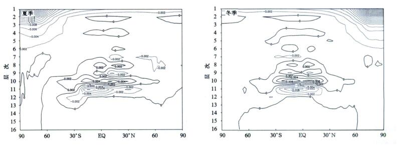 | 图 3. 两种辐射方案晴空大气短波吸收率差值的经向-高度剖面 (Fu方案-Mor方案) Fig 3. Meridion-height section of differences in shortwave absorption rate between two radiative schemes in clear sky (Fu scheme-Mor scheme) | |