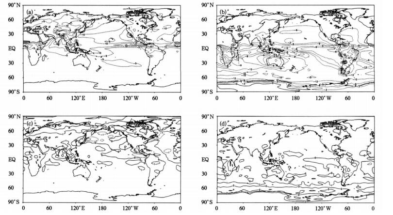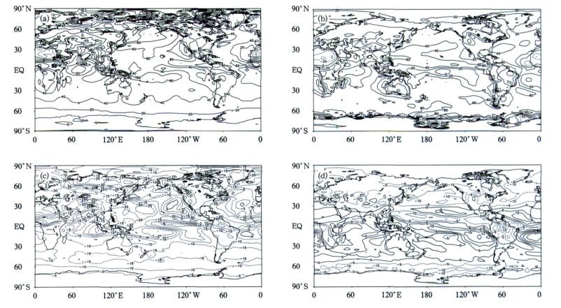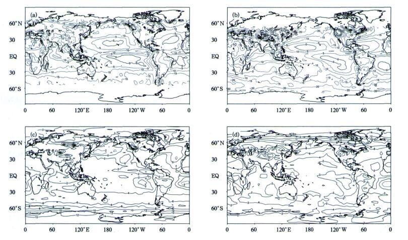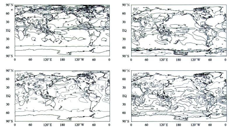 | 图 4. 行星反照率差值 (单位:%)(a, b:Mor方案-ERBE; c, d:Fu方案-Mor方案; a, c:夏季; b, d:冬季) Fig 4. Differences in the planetary albedo (unit:%)(a, b:Mor scheme-ERBE, c, d:Fu scheme-Mor scheme; a, c:summer; b, d:winter) | |