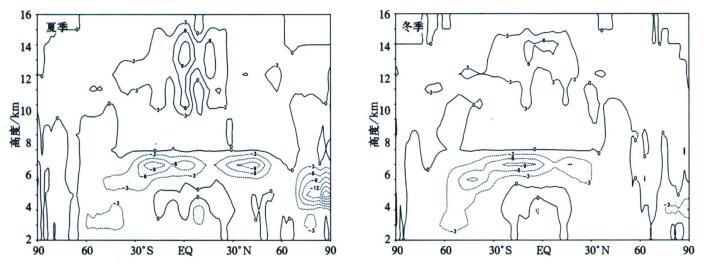 | 图 7. 纬向平均总云量变化的经向-高度剖面 (单位:%)(Fu方案-Mor方案) Fig 7. Meridion-height section of the total cloud cover change (unit:%)(Fu scheme-Mor scheme) | |
