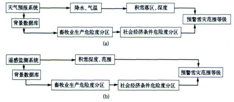 | 图 1. 雪灾预警及评估模式流程 (a) 天气学雪灾预警模型流程, (b) 遥感雪灾预警模型流程 Fig 1. Plan of snow calamity forecasting and evaluating (a) snow calamity forecasting for meteorology, (b) snow calamity forecasting for remote sensing | |