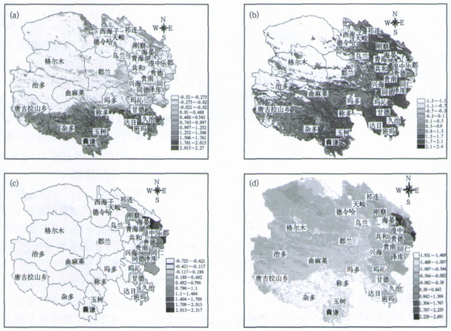 | 图 2. 青海雪灾畜牧业危险度空间分析 (a) 牧草产量分布, (b) 草场类型分级, (c) 牲畜密度分布, (d) 畜牧业生产危险度分布 Fig 2. Spacial analysis of snow calamity animal husbandry fragility degree in Qinghai (a) distribution of pasturage yield, (b) classification of grassland type, (c) distribution of animal numbers, (d) distribution of fragility degree on livestock husbandry | |