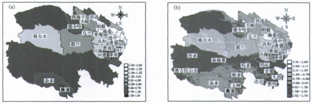 | 图 3. 青海高原雪灾危险度分区 (a) 以社会经济危险度函数的分区结果, (b) 以综合社会经济危险度和畜牧业生产危险度函数的分区结果 Fig 3. Compartmentalizing by snow calamity fragility degree in Qinghai Plateau (a) result of compartmentalizing by function of fragility degree on livestock husbandry, (b) result combined by function of fragility degree on society economic level and function of fragility degree on livestock husbandry | |