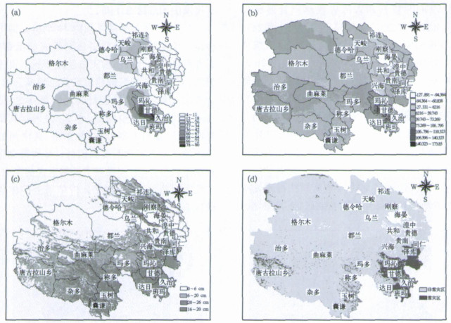 应用MODIS资料和青海省牧草产量遥感模型, 计算得出青海省2003年牧草产量分布 (图 2a); 对青海草场按荒漠草场、草原草场、草甸草场, 按草场型和草场质量状况进行了等级划分, 得到图 2b的结果; 由1998年青海省各县载畜量和可利用草场面积, 求得青海省牲畜密度分布 (图 2c); 依据式 (6), 对青海省牧草产量、草场等级、牲畜密度进行空间分析得到青海省雪灾畜牧业生产危险度分布, 如图 2d所示。从分析结果可以看出, 青海南部地区雪灾畜牧业生产危险度小于海西、海北等地, 环青海湖区有一个危险度高值区, 也就是说从牧草和牲畜密度单纯来考虑, 青海省环湖区是雪灾高发区, 而青南地区雪灾发生的危险性不高。