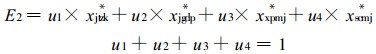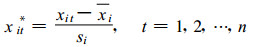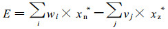 式 (2) 中, E为危险度函数, 衡量预警区域发生雪灾可能性大小的等级函数, 值越大, 表示发生雪灾的可能性越大, wi, vj是权重值, 表示危险度因子对雪灾脆弱性贡献率的大小, xn*和xz*是危险度因子, 按照对雪灾发展趋势的影响作用, 分为正向和逆向两类, 正向危险度因子 (xz*) 是指对草地畜牧业和抗灾救灾有良好影响的指标, 数值越大, 危险度越小, 而逆向危险度因子 (xn*) 则相反。