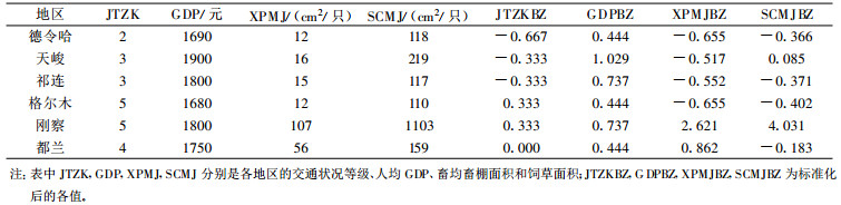 交通状况、人均GDP、畜均畜棚面积、人工草地面积作为社会经济危险度因子, 均通过上一年当地国民经济统计数据获得。交通状况为等级值, 共分10级, 其他资料为实际值。