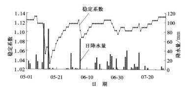以铜鼓县新城区何家洞滑坡为例, 根据文献[11]的稳定系数计算公式, 得到逐日滑坡稳定系数。图 6为根据2004年5月1日至8月11日监测和试验资料计算的滑坡体稳定系数变化。图中柱状为日降水量, 曲线为逐日稳定系数值。结果表明, 在2004年5月16日滑体稳定系数为最小值, 此时正处在当年汛期累积降水量和持续时间最长的降水过程中。滑坡稳定系数与降水量有较好的负相关关系, 当降水量增大时, 滑坡稳定系数减小, 且略滞后于降水量的峰值, 各试验点在监测时间内稳定性系数的最小值见表 3。其中定南县岭北镇龙头村和目2组滑坡稳定性系数为0.97, 处于不稳定状态, 与应力、位移监测结果一致。分析认为, 形成定南监测点滑坡不稳定的成因是, 2004年4月24日, 受西南暖湿气流和冷空气共同影响, 江西省中南部出现了强降水天气, 其中定南4月24日09:00左右出现了1 h降水量达45 mm的强降水, 24 h降水达65 mm, 受其影响, 滑坡体呈现了不稳定状态。其余各监测点的最小稳定性系数K均大于1, 说明在试验期间, 除定南外, 其余7个监测点滑坡均处于稳定或接近稳定状态。