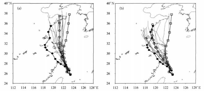 | 图 1. BGM方法(a)和MPP方法(b)预报的0509“麦莎”72 h路径 (起报时刻为8月5日08:00, 实心圆线为实况路径, 空心圆线为集合预报路径, 空心正方形线为控制试验预报路径, 其他直线为扰动成员预报路径, 时间间隔为6 h) Fig 1. The 72 h tracks of Maisa(0509)forecasted by the methods of BGM(a)and MPP(b) (the initial time is 08:00 on August 5;line with solid circles:best track; line with empty circles:ensemble mean track; line with empty squares:control forecast; other lines:perturbation members; time interval:6 h) | |
