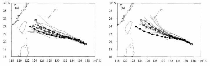 尽管方案C的集合预报效果比方案A和方案B有了改进, 但其结果总体上与实况仍有一定的偏差, 究其原因, 一方面与试验模式模拟热带气旋时存在的系统性偏差有关, 另一方面与模式初始场上涡旋的位置偏差有关。试验模式MM5是适用于中纬度气旋锋面系统、暴雨、中尺度对流系统等的非静力有限域模式, 并不是针对热带气旋的, 因此在模拟热带气旋时会存在一定的系统性偏差; 此外在试验中直接将AVN全球谱模式的12 h预报场作为模式积分的初始场, 没有加bogus, 也没有对初始涡旋位置进行调整, 当初始涡旋位置与实况存在较大偏差时, 其结果不可避免地会受到影响而存在偏差。