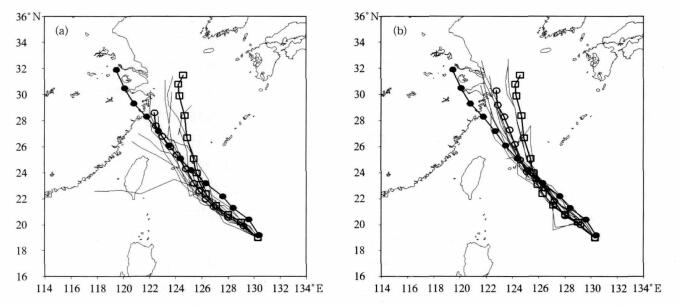 5 小结本文以MM5模式作为试验模式, 分别用增长模繁殖法(BGM)对初始场进行扰动形成扰动成员和组合不同的物理参数化方案对模式物理过程进行扰动(MPP)形成扰动成员, 对2005年登陆我国的8个热带气旋进行了52次路径集合预报试验, 集合成员为12个。