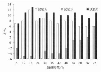 | 图 4. 试验A、试验B和试验C的52次预报的平均技巧水平R Fig 4. The mean skill levels R from 52 forecasts of test A, test B and test C | |