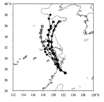 | 图 5. 不同方法预报的0505“海棠”72 h路径 (起报时刻7月15日20:00, 实心圆线为实况路径, 空心圆线为控制试验预报路径, 三角形线、空心正方形线和实心正方形线分别为试验A、试验B和试验C的集合预报路径, 时间间隔为6 h) Fig 5. The 72 h tracks of Haitang(0505)forecasted by different methods (the initial time is 20:00 on July 15; line with solid circles:best track; line with empty circles:control forecast; line with triangles:ensemble mean track of test A; line with empty squares:ensemble mean track of test B; line with solid squares:ensemble mean track of test C; time interval:6 h) | |
