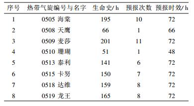 2 试验个例2005年西北太平洋和南海海域发生的风暴级以上的热带气旋共23个, 其中8个在我国登陆。8个热带气旋中0508“天鹰”和0510“珊瑚”为强热带风暴, 生命史较短, 其余6个都达到台风强度, 生命史长, 影响强度大、范围广, 造成的损失巨大。