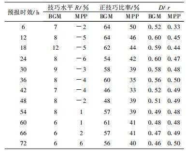 表 3给出了对52次路径, BGM方法和MPP方法的集合预报相对于控制试验的平均技巧水平R以及两种方法的平均Spread与Frms比值, 还给出了集合预报正技巧的次数占总次数的比率, 简称为正技巧比率。从表 3可以看到, 对于BGM方法, 从预报时效6 h到72 h, 集合预报相对于控制试验都为正技巧, 技巧水平在6%以上, 最高的达到12%, 从正技巧比率看, 除了个别时效外, 其余都在55%以上, 由此可见BGM方法的集合预报结果总体上好于控制试验。MPP方法的集合预报结果总体上则不如控制试验, 表 3显示, 从预报时效6 h到48 h, 集合预报相对于控制试验都为负技巧, MPP方法的正技巧比率也都在50%以下。再看发散度的情况, 两种方法的发散度都偏小, 尤其是MPP方法。
