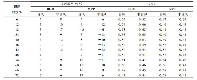 表 4为对25次台风路径和27次非台风路径, BGM方法和MPP方法的集合预报相对于控制试验的平均技巧水平R与两种方法的平均D/r。表 4显示, MPP方法对台风和非台风的集合预报效果相反, 对台风, 除了预报时效18 h外, MPP集合预报相对于控制试验都为正技巧, 从时效54 h到72 h, 技巧水平在15%以上, 集合预报的改进效果明显, 对非台风, MPP集合预报结果都比控制试验结果差, 而且大部分时效集合预报相对于控制试验的技巧水平在-10%以下; 对于BGM方法, 虽然对两类热带气旋, 集合预报相对于控制试验都为正技巧, 但BGM方法对非台风的集合预报效果好于对台风的集合预报效果, 从表 4还可以看到, BGM方法对非台风的技巧水平明显高于对台风的技巧水平; 从D/r结果看, 无论BGM方法还是MPP方法, 两类热带气旋中集合预报效果好的系统发散度总体上略大些, 但仍存在偏小的问题。