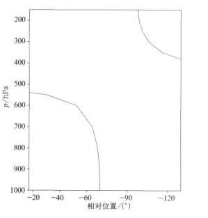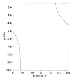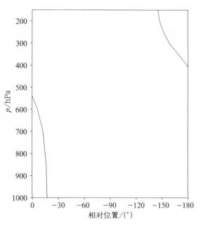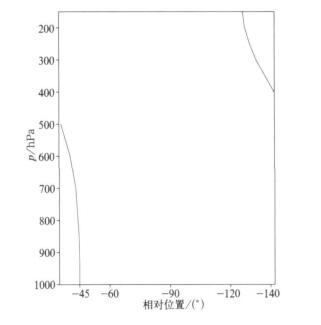 用牛顿迭代法计算式 (12) Nc2取不同的值时对应y近似余弦值稳定和不稳定区的分界点随高度变化, 再换算成对应余弦的角度。计算结果表明在-80.1 m2·s-2≤Nc2≤-10.5 m2·s-2范围内, y的分界点曲线低层位于低空急流轴的北侧, 随着