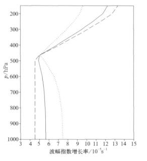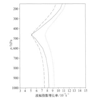 αi有正负两个值, 包括一个增长的波和一个衰减的波, 波的稳定度取决于增长的模。这里考虑B2 < 0, 即在切变线南侧到低空急流之间波扰动不稳定的情况。对流层低层和高层波动不稳定指数增长率变化趋势相反, 即在基本气流风向转折处 (即风速接近0, p=462.3 hPa高度) 的上下层次波幅指数增长率变化不同, 对流层低层波动振幅增长随高度略呈减少趋势, 在p=462.3 hPa以上, 波动振幅增长随高度增加, 这与对流层水平风随高度的变化一致, 说明水平风切变和切变强度的不均匀显著地影响波动不稳定的增长情形。图 5是U0=10 m·s-1, Nc2=-50 m2·s-2情形下切变线南侧不同位置的波幅指数增长率。从图 5可知, 在相同基本气流中, 相同湿度条件下, 从切变线到急流轴, 波的不稳定度低层明显加大, 急流轴上波的不稳定度达最大, 即由切变强度不均匀B2影响的波动最大不稳定出现在低空急流轴上, 这与上述分析一致; 而高层呈相反的变化趋势, 说明在气旋区域 (低空急流轴北侧) 和反气旋区域 (高空急流的南侧) 波幅指数增长变化是不同的, 在这里二者呈相反的变化趋势。图 6表示急流轴上不同风速和湿度特征值时的波幅指数增长率。在同一纬度, 湿度不变, 风速加大, 低层不稳定度也增大, 如图 6中的虚线和实线; 同一纬度, 风速相同, 湿度增加, 波动不稳定度也变大, 如图 6中的虚线和点线。