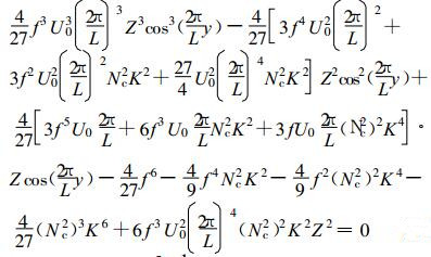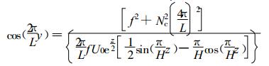 (B2Nc2K)2-4[(F2 +Nc2K2)/3] 3≥0时, ω1为实数解, ω2,3是复数解, ω2,3的前3项为实数, 后两项为虚数, 实部是波动的局地频率, 虚部为波幅随时间呈指数增大。ω2,3含i的虚数项有正负两个值, 正值对应增长的波, 负值对应衰减的波, 后者很快消失没有意义, 这里主要探讨增长波的情形。于是由水平纬向风切变强度的不均匀分布影响CISK惯性重力波不稳定的判据为:
