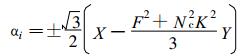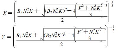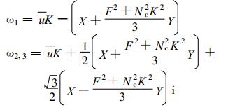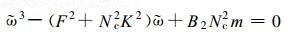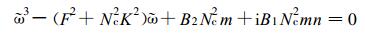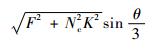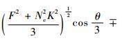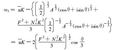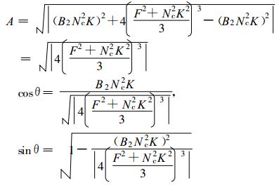 显然, 在这里决定运动发展性质最关键的是含二次根号项, 若根号内数值是负值, 即 (B2Nc2K)2-4[(F2 +Nc2K2)/3] 3 < 0, 需要进一步展开频率解, 以便更清晰地分开复数的实部和虚部。ω1, ω2,3第2项和第3项括号中均为复数。先对ω1进行分解, 用三角函数表示ω1中的第2项和第3项,