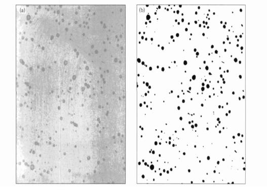 以2004年8月28日18:48(北京时, 下同) 观测到的雨滴谱资料中一个观测时次的滴谱为例, 说明资料的处理过程和结果。首先将所观测的雨滴谱资料扫描成JPG格式的图像文件 (见图 3a)。转换程序会对原始图进行净化处理-得到一张只有黑白两种颜色的BM P图像, 比较这两张图可以看出, 雨滴的大小以及位置分布没有丝毫的变化, 显得更加清晰, 为了提高资料处理结果精确度, 如果遇到重叠严重的滴谱, 可以通过人工方法将它分开。