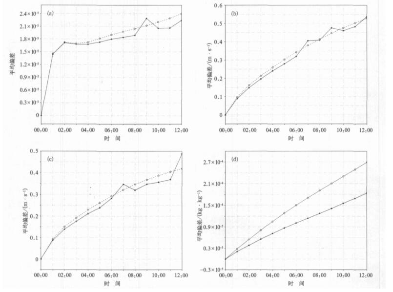 表 6 切线性模式扰动比湿场与包括全物理过程非线性模式扰动场平均偏差 (单位:10-4kg/kg) Table 6 Mean departure of the evolution of perturbed specific humidity between the tangent-linear model and the nonlinear model with full physics (unit:10-4kg/kg) |