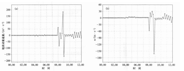 | 图 2. 修改切线性垂直扩散方案前异常单格点上最低层扰动变量随时间演变 (a) 地表动量通量, (b) u风场 Fig 2. Temporal evolution of perturbed variable at an abnormal grid from the original linearied vertical diffusion scheme (a) momentum flux at the surface, (b) u-wind | |
