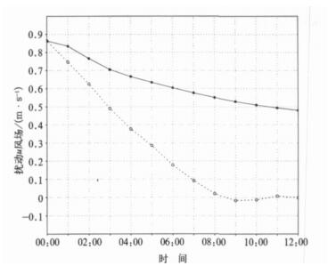 | 图 3. 修改切线性垂直扩散方案后单格点最低层扰动u风场与非线性扰动u风场随时间演变 (实线:切线性模式的结果; 虚线:非线性模式的结果; 格点位置同图 2) Fig 3. Temporal evolution of perturbed u-wind at the same location as Fig.2 after the modification of linearied vertical diffusion scheme (solid line denotes the results from the tangent-linear model, dashed line denotes those from the nonlinear model) | |