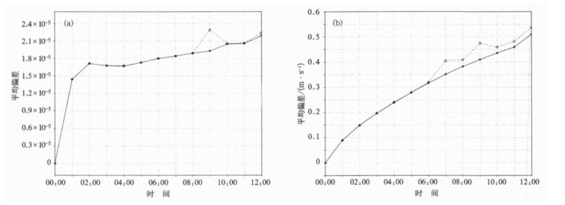 | 图 4. 切线性模式和非线性模式的平均偏差 (a) 无量纲气压, (b) u风场 (均只有动力框架和垂直扩散方案; 虚线:切线垂直扩散方案修改前; 实线:切线垂直扩散方案修改后) Fig 4. Mean departure between the tangent-linear model and the nonlinear model including vertical diffusion (a) non-dimensional pressure, (b) u-wind (dashed line denotes tangent-linear results are obtained with the original linearied vertical diffusion scheme, solid line denotes the modified scheme) | |