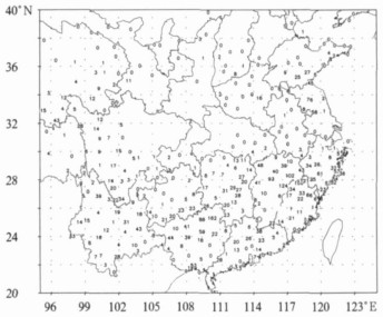 | 图 1. 2005年6月19日08:00的24 h降雨量 (单位:mm) Fig 1. 24-hour accumulated precipitation at 08:00 on July 19, 2005 (unit:mm) | |