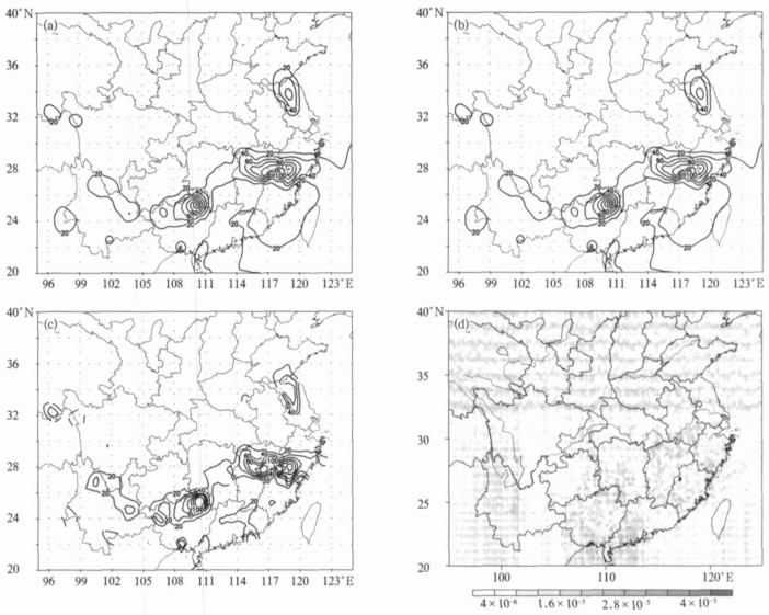 | 图 2. 3种方法分析的降水量等值线以及对偶Kriging方法与泛Kriging方法差异 (单位:mm) (a) 对偶Kriging方法, (b) 泛Kriging方法, (c) Cressman方法, (d) 对偶Kriging方法与泛Kriging方法之差 Fig 2. The precipitation contours by these three methods and the difference of the contour by Dual Kriging to that by Universal Kriging (unit:mm) (a) Dual Kriging method, (b) Universal Kriging method, (c) Cressman method, (d) the difference | |