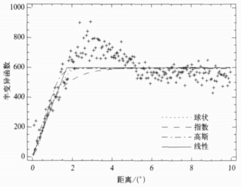 δ=10°的样本对来统计半变异函数。半变异函数的统计结果图 3也证明这样选择是合理的, 分开距离大于5°时半变异函数几乎不再变化。因此合理选择分组数N和组的宽度δ非常重要。组的宽度δ太小会导致组中的样本对个数太少从而统计缺乏可信度, 一般保证组中的样本对个数不少于50统计才是基本可信的。同理分组数N太小会使拟合的半变异函数不可信, 因此分组数N一般取为N·δ等于最大分开距离的