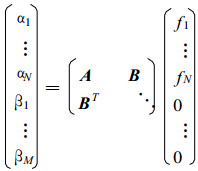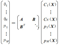 其中, Cij=C(hi(Xj)) 和Ci(X)=C(hi(X))。由于式 (12) 的右端项依赖于插值点的空间位置向量X; 因此对于每个插值点X, 都要重新求解方程组 (12), 得到权重θi代入式 (2), 才能得到插值点X的值f(X)。如果样本数和网格数都非常庞大, 式 (12) 变成一个大型线性系统, 求解大型线性系统非常耗时, 因此泛Kriging方法的计算量将会非常大。对偶Kriging方法通过等价变换将式 (12) 变换为不依赖于插值点的形式, 因此只需求解一次方程组, 从而大大提高计算效率。