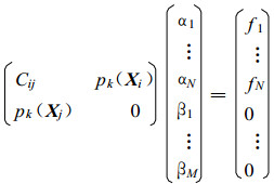 Kriging方法通常包括普通Kriging方法 (Ordinary Kriging) 和泛Kriging方法 (Universal Kriging) 等。普通Kriging方法假设区域化变量符合二阶平稳假设和本征假设, 而泛Kriging方法假定区域化变量具有某种以多项式表征的倾向, 从而无需平稳假设, 适合于非平稳情形[1, 6-7]。非对偶Kriging方法是一个局部插值方法, 对每一个插值点都需要重新建立Kriging线性方程组并求解该方程组, 因此计算时间非常大。Le等[12]针对非对偶Kriging方法的计算效率问题, 通过等价变换将泛Kriging方法转换成对偶Kriging方法 (Dual Kriging) 实现了区域化变量的全局插值, 全局插值使得仅需一次构造和求解Kriging线性系统, 所以减少了大量的计算时间, 而且与泛Kriging方法是完全等价的。