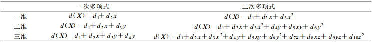 式 (4) 中, M的取值和pk(X) 的形式由位置向量X的维数和pk(X) 多项式的最高次数决定。pk(X) 多项式的最高次数一般采用一次或两次, 次数太高容易产生上冲或下冲现象。因此倾向项d (X) 与向量X的维数、pk(X) 多项式最高次数的关系见表 1, 而M(M=1时, 退化为普通Kriging法) 就取等于倾向项相加项的个数。