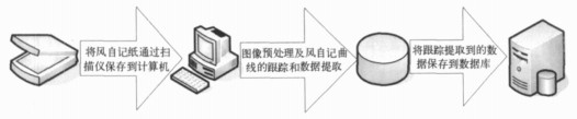 1.1 系统的工作流程系统将电接风向风速自记纸通过扫描仪输入到计算机并保存, 然后通过图像处理和识别技术对输入的电接风向风速自记纸图像中风自记曲线进行跟踪和识别, 并且提取出曲线所表征的数据, 最后将提取到的风向风速数据保存到数据服务器 (图 1)。