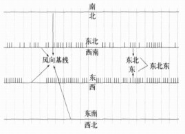1.3.3.1 风向曲线的跟踪和量化在电接风向风速自记纸上 (如图 3所示), 一共有4条风向曲线, 分别用于判定南/北、东北/西南、东/西、东南/西北, 每一条风向曲线都有一条风向基线, 风向基线是用于判定风向的参照线, 某一时刻风向的判别是由此时刻风向曲线相对于风向基线的位置决定的。例如在判定南北风的风向时, 如果某一时刻的风向曲线位于此南北风向基线的上方, 就代表是南风。位于此南北风向基线的下方, 就代表是北风。某一时刻真正的风向是以上4条风向曲线上表征风向的组合。例如某一时刻同时出现东风曲线和东北风曲线, 则此时刻风向为东北东, 4条风向曲线最多可以组合出16个风向。
