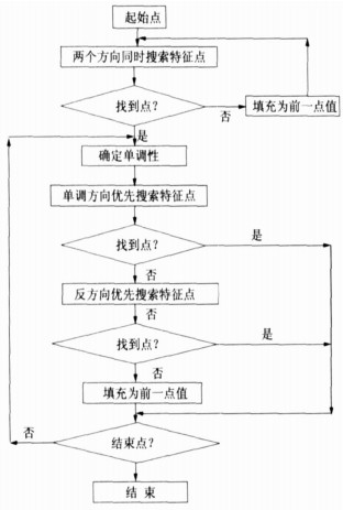 根据曲线的单调增减趋势跟踪图像信息:根据自记纸中风速部分的数据提取要求, 只要找到曲线的特征点[11], 就可以得到细化的曲线, 这条曲线呈波浪型, 从波峰到波谷或从波谷到波峰的每个分区间内的单调性都是固定的。利用这个特征, 首先根据单调性确定单调区间, 在单调区间内根据曲线趋势寻找有效的特征点[12-13]。但由于自记仪硬件原因, 在记录过程中不是所有的点都遵循这个单调性的, 因而对曲线进行反方向搜索也是必要的。其过程如图 4所示。
