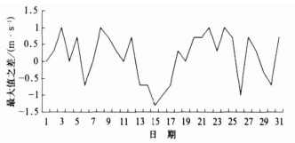 人工选取的日风速最大值与系统提取的日风速最大值在日最大值出现的时间和大小方面都有一定的出入, 图 5是人工与系统提取的日最大值之差月变化曲线。从图 5中可以看出, 人工选取的日最大值与系统提取的日最大值相差1 m/s以内的有30 d, 占全月31 d的97%, 相差在1.3 m/s以内的1 d, 占全月31 d的3%。