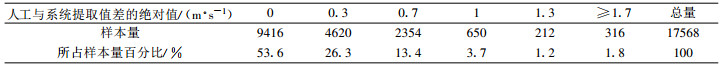 产生差异的原因之一在于迹线粗细变化给风速值的选取带来一定影响。另外, 系统提取最大风速是按照每隔1 min的滑动窗口来提取的, 人工是以经验判断曲线的最陡处, 所以会产生差异。