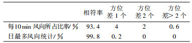 2.2 风向测试结果通过对以上4站 (每站各1个月) 的人工与系统风向提取值的逐一比较, 风向总体测试情况如表 2所示, 人工选取的风向与系统提取的风向相符率占93.4%, 不相符率占6.6%, 基本符合数字化精度的要求。通过对日最多风向统计, 相符率达到99.8%, 另有0.2%的日最多风向值与人工选取的不相符。究其原因, 风速较小时风向摇摆不定, 使得人工和系统对风向的判别产生了一定偏差, 同时, 图像质量也是影响系统对风向判定的原因之一。