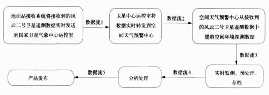 | 图 1. 风云二号静止气象卫星空间天气监测预警系统流程图 Fig 1. The flow chart of space weather monitoring and warning based on FY-2 | |