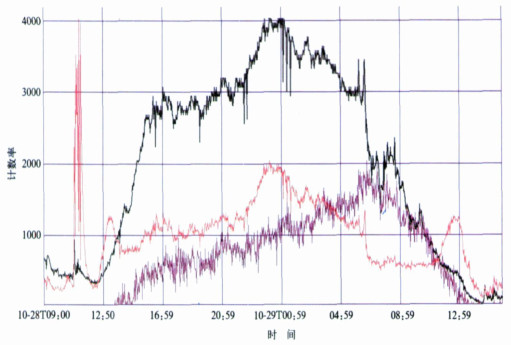 | 图 3. 风云二号气象卫星2003年10月28日09:00至29日16:00数据 (黑线为软X射线, 红线为硬X射线, 紫线为P1能道的质子) Fig 3. Observinging result of FY-2 satellite solar X-ray detector from 09:00 on Oct 28 to 16:00 on Oct 29, 2003 (black line:the soft X-ray; red line:the hard X-ray; purple line:the high-energy particles channel P1) | |